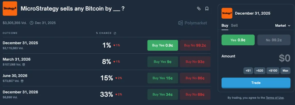 С другой стороны, пользователи Polymarket оценивают вероятность продажи биткоинов Strategy до конца года как крайне низкую — около 1%.