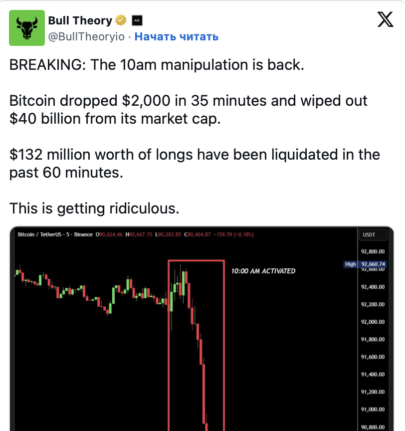 Резкое падение произошло позднее, ближе к середине американского торгового дня. Цена биткоина кратковременно опустилась ниже $90 000, после чего стабилизировалась. Это указывает на отложенное давление, а не на движение, спровоцированное непосредственно открытием торгов.
