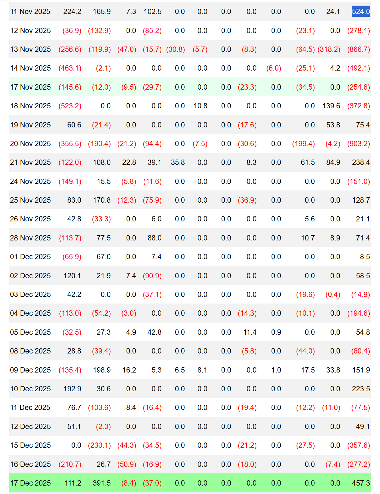 Восстановление произошло после нестабильного периода в ноябре и начале декабря, когда притоки чередовались с ощутимыми оттоками. Последний раз спотовые биткоин‑ETF фиксировали притоки свыше $450 млн 11 ноября, когда фонды привлекли около $524 млн за один день.