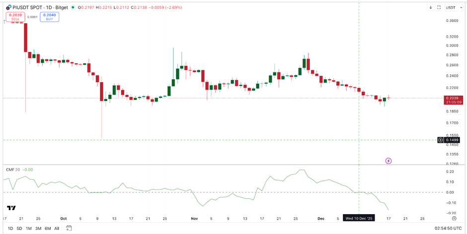 Показатели денежного потока Чайкина на двухчасовом графике остаются слегка отрицательными, держась чуть ниже нулевой линии. Хотя это показывает, что давление на продажи ослабло с пика, это также подтверждает, что приток капитала пока не доминирует.