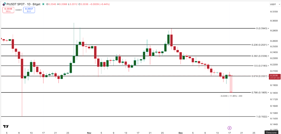 В дневном таймфрейме Биткоин остаётся зафиксированным под чётко очерченной нисходящей линией тренда, проведённой от октябрьских максимумов. Каждая попытка восстановки с тех пор терпела неудачу ниже этого уровня, усиливая его как структурный потолок, а не временный барьер.
