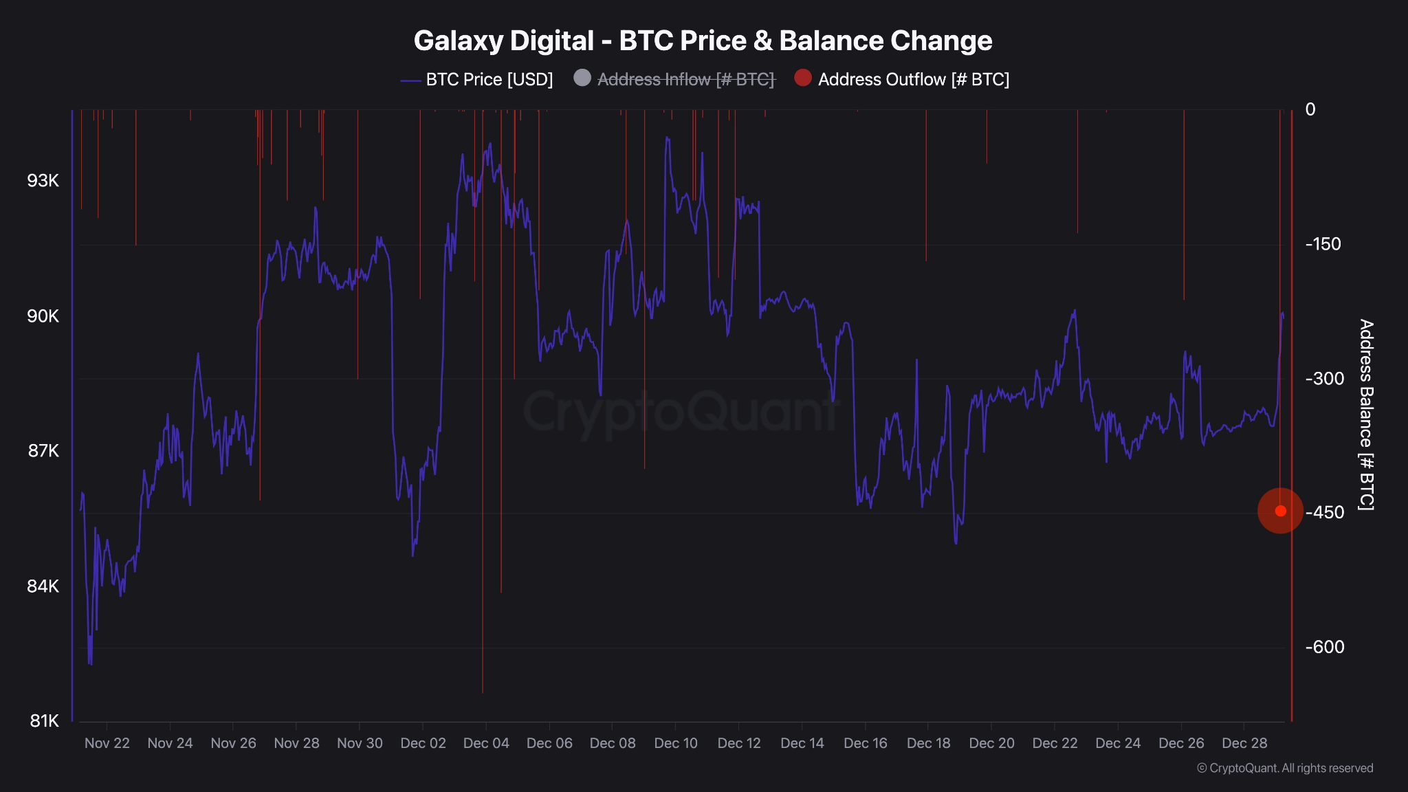 Тем временем активность на рынке остается неоднородной. Пока одни институциональные игроки покупают, другие фиксируют прибыль. Darkfost сообщил, что Galaxy Digital переместила около 447 BTC ($39 млн), что может указывать на продажи.