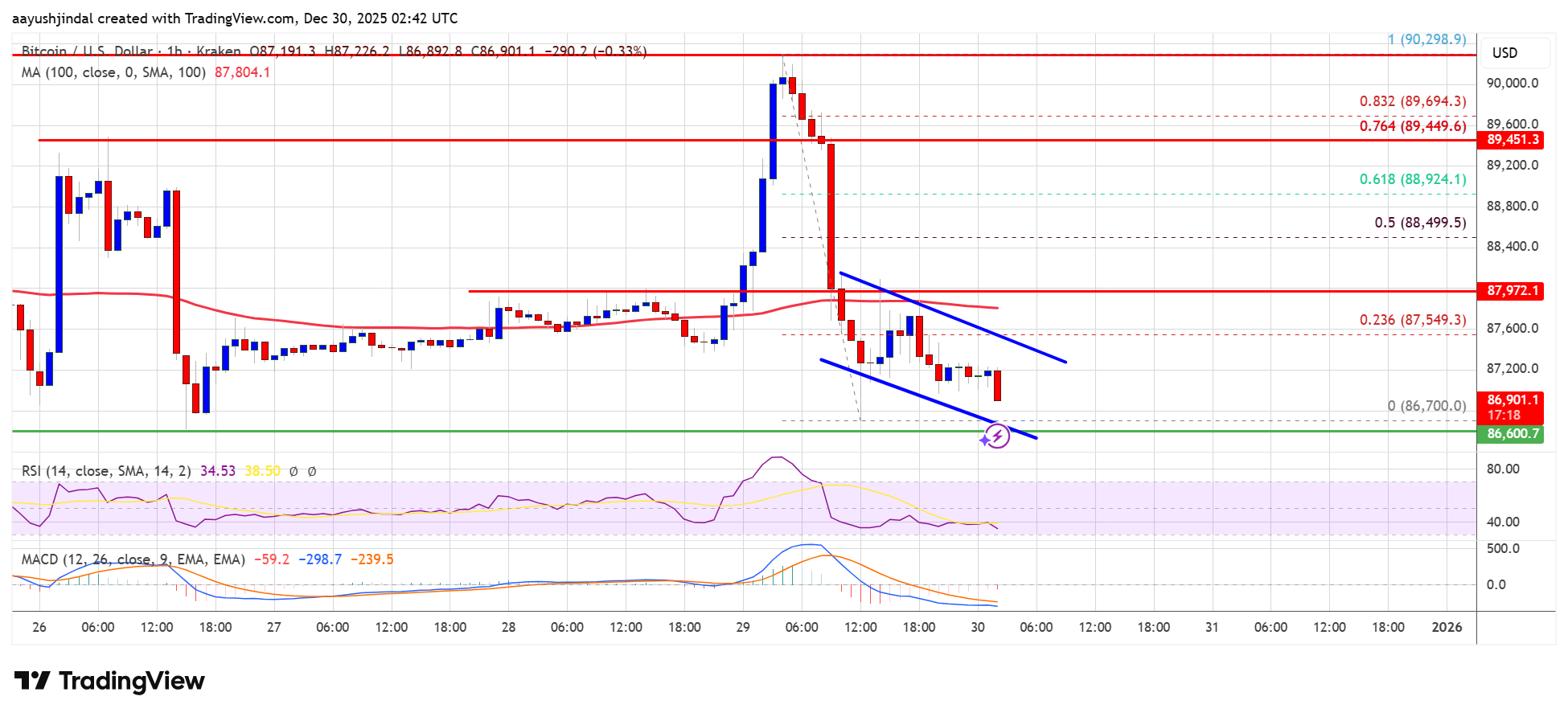 Биткоин сейчас торгуется ниже отметки в 88 000 долларов и 100-часовой простой скользящей средней. Если цена останется стабильной выше отметки в 86 500 долларов, она может попытаться начать новую волну восстановления. Ближайшее сопротивление находится вблизи отметки в 87 500 долларов. Кроме того, на часовом графике пары BTC/USD формируется нисходящий канал с сопротивлением на уровне 87 500 долларов.