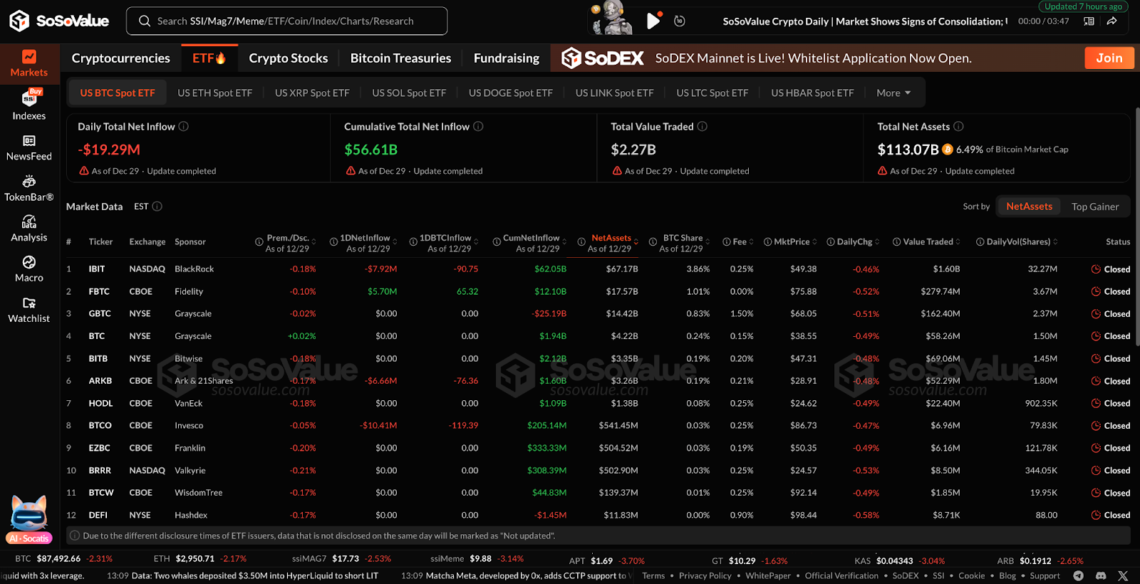 Американские спотовые биткоин-ETF зафиксировали чистый отток в $19,3 миллиона 29 декабря, продлив серию осторожного институционального позиционирования. Общая торговая стоимость составила $2,27 миллиарда, что отражает стабильную активность, но ограниченную уверенность со стороны покупателей.
