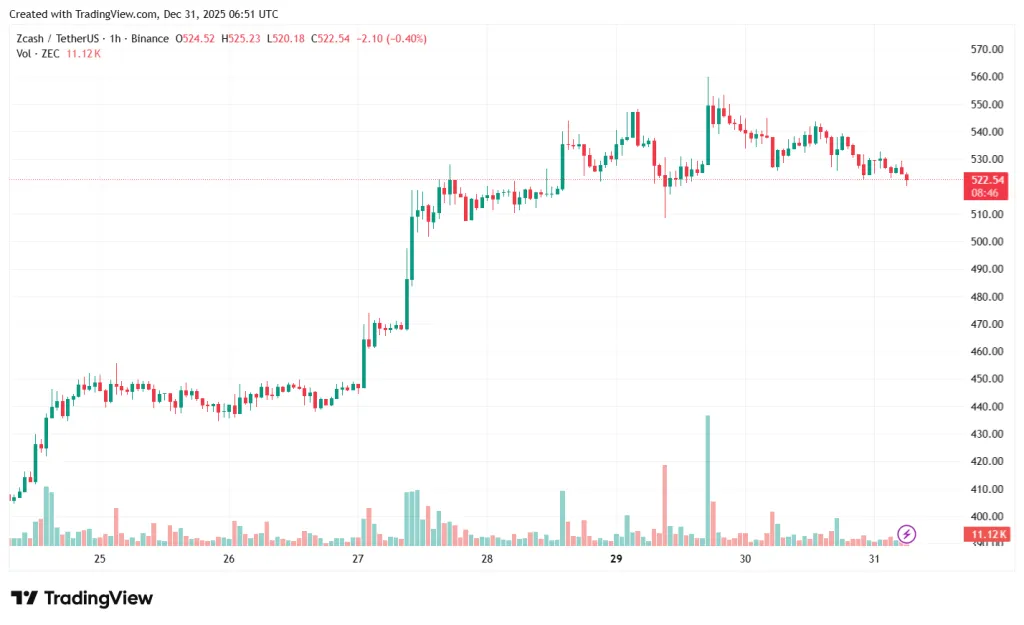 Курс ZEC составляет $522 (-1,9%).