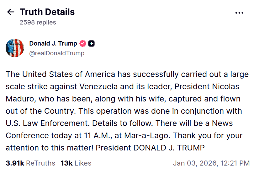 Сначала появились новости о том, что США нанесли авиаудары по Каракасу, столице Венесуэлы. Затем глава Штатов Дональд Трампа написал в соцсети Truth Social, что президента Венесуэлы захватили и «вывезли из страны».