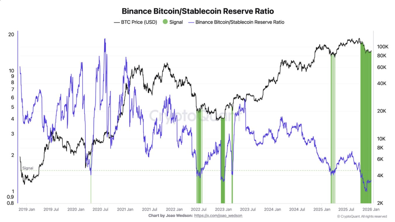 Есть еще одно любопытное наблюдение. Аналитики обращают внимание на соотношение биткоина к стейблкоинам на бирже Binance (Binance Bitcoin/Stablecoin Ratio). Метрика начала расти.