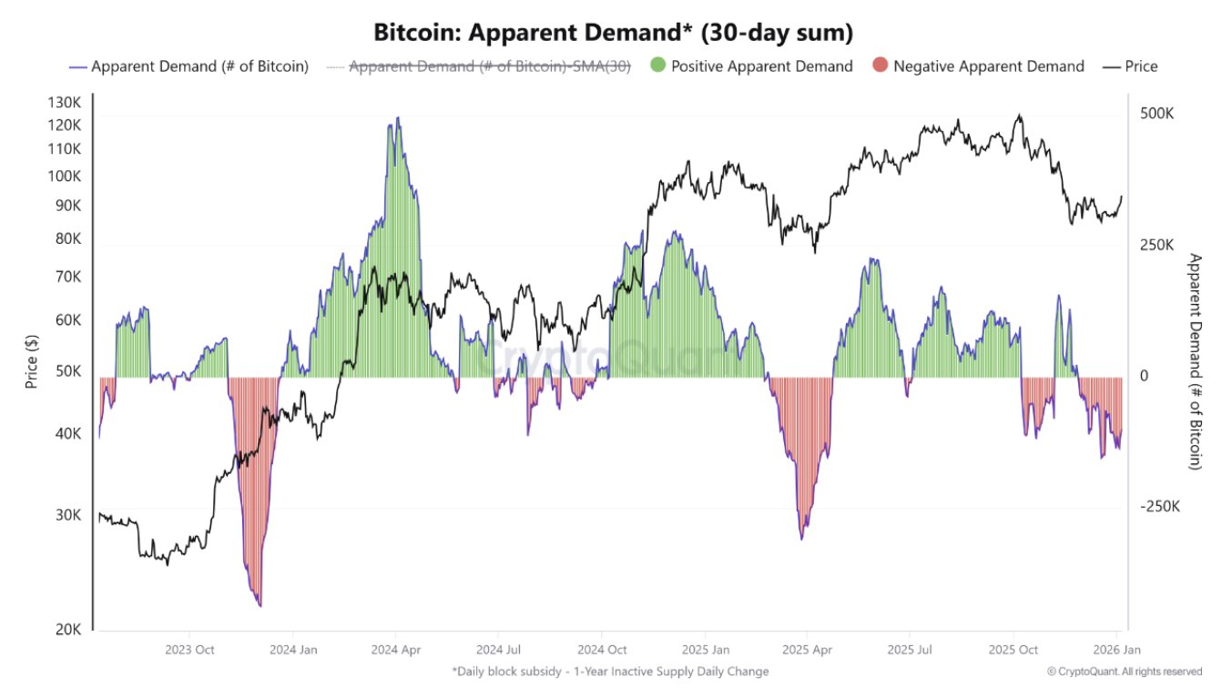 Несмотря на активность в ETF-сегменте часть аналитиков сохраняет осторожность. Дело в том, что видимый ончейн-спрос на биткоин остается слабым и нуждается в восстановлении.