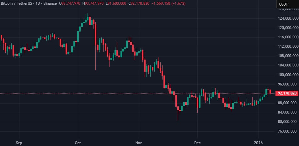 Отметим, на момент написания биткоин торгуется около отметки в $92 000: