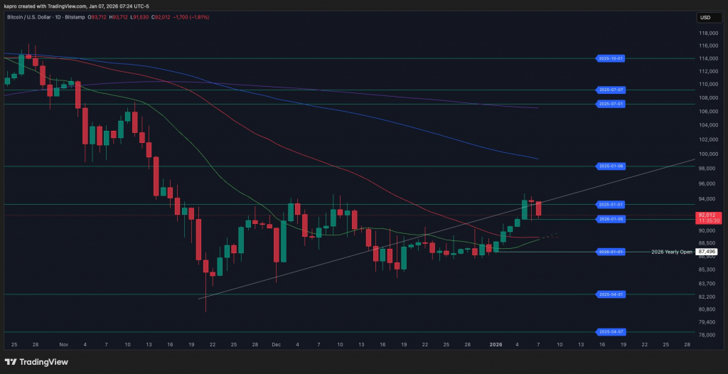 «FireCharts показывает битву в реальном времени в ордербуке биткоина, — говорит Алан. — Быки пытаются защитить поддержку на уровне 5 января 2026 года, но крупные игроки, похоже, ищут тест поддержки ближе к уровню начала года, прежде чем сформируется золотой крест на дневном графике для запуска следующего ралли».