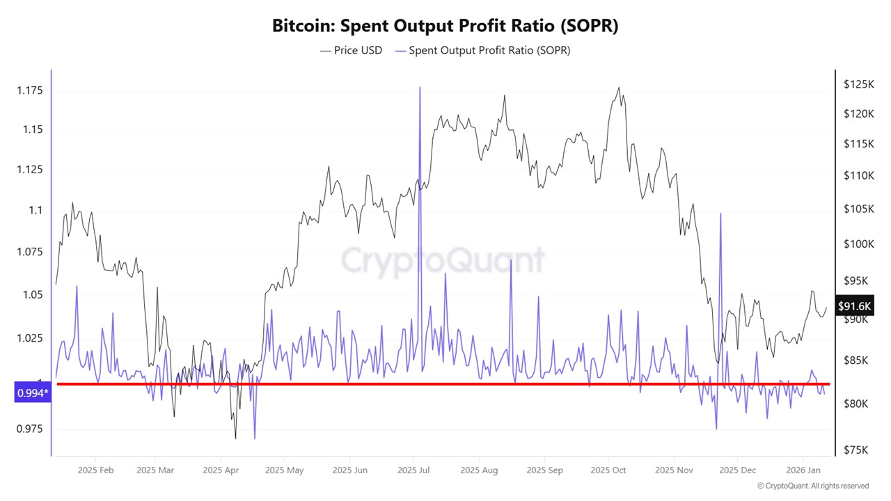 Другой важный индикатор, известный как SOPR, показывает, что монеты почти не движутся, а получение прибыли ограничено. Проще говоря, инвесторы удерживают, а не торгуют. Это указывает на терпение, а не на страх.