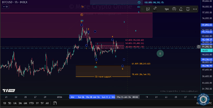 Если Биткоин прорвётся выше понедельничного максимума около $92,450, это может открыть дверь для движения к $97,000–$98,400. Тем не менее, продавцы не проявляют особой силы. Пока Биткоин держится выше недавнего минимума около $89,200, общая структура остаётся стабильной.