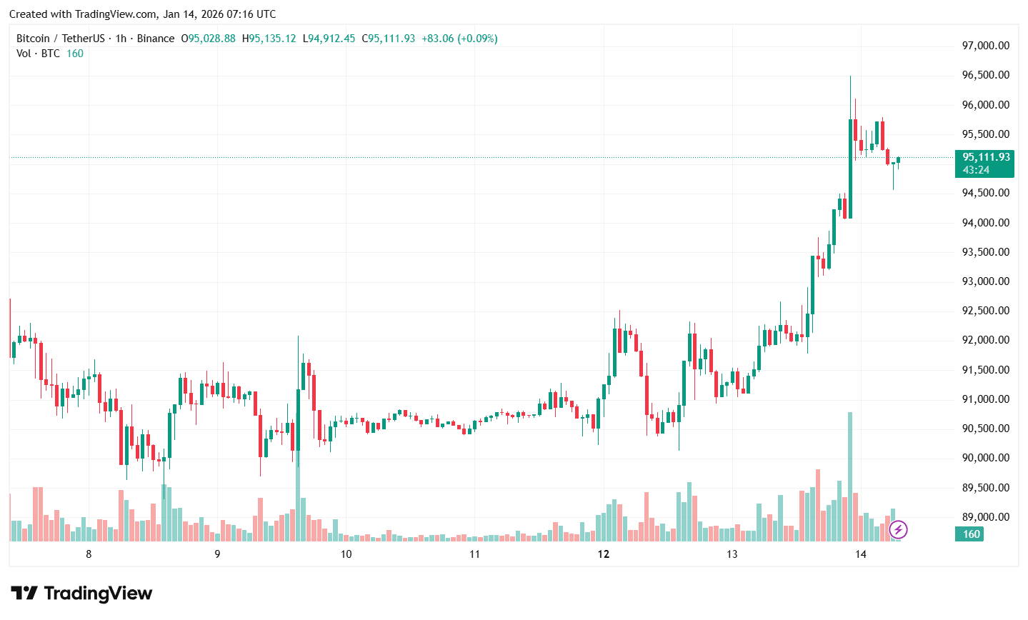 Вечером 13 января 2026 года большинство криптоактивов отметились положительной тенденцией. Биткоин, в частности, в моменте достиг $96 500, но затем откатился, согласно TradingView.
