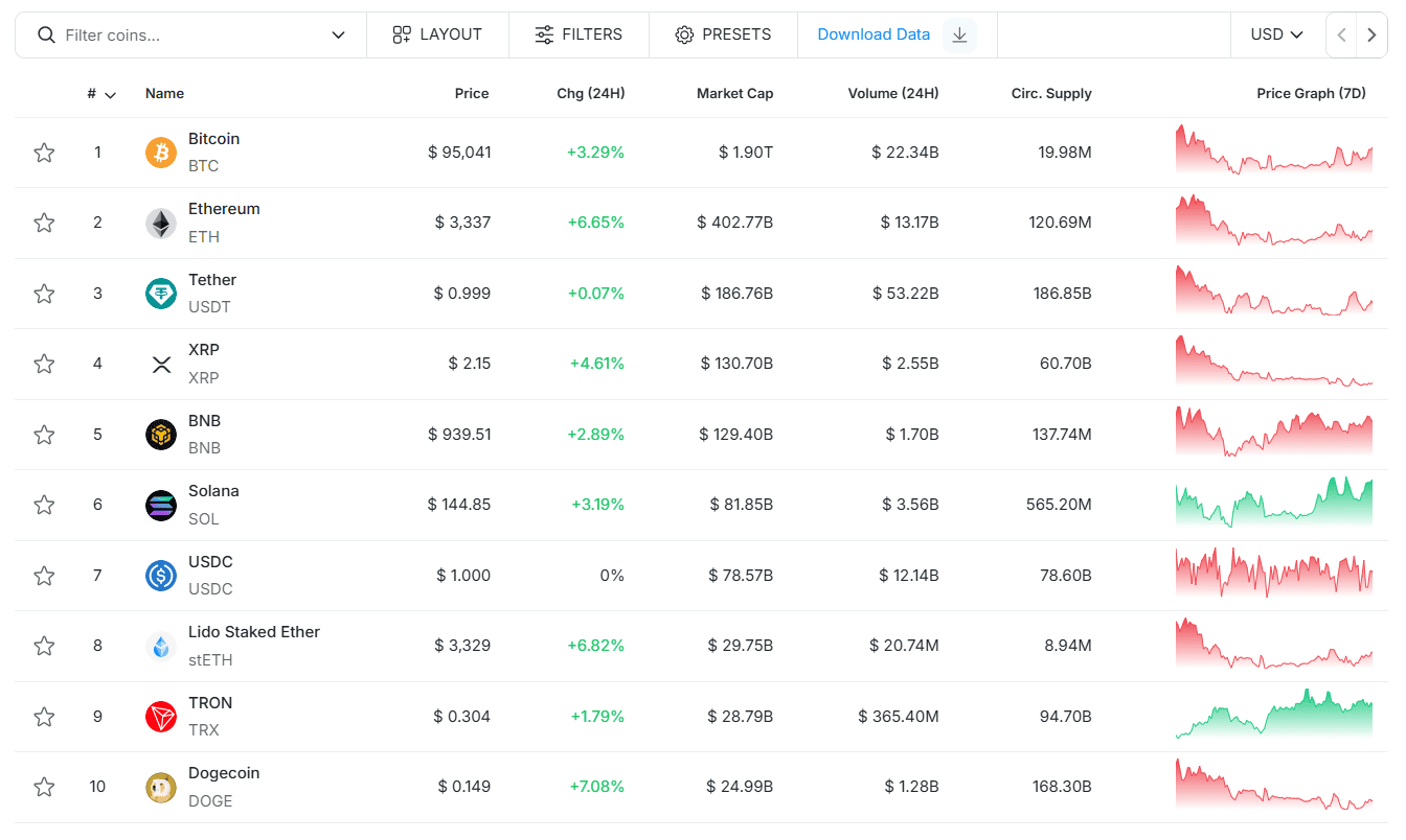 Вслед за биткоином положительной динамикой отметились и другие криптоактивы. Прирост на суточном графике по Ethereum составляет 6,6%, XRP — 4,6%, DOGE — 7%.