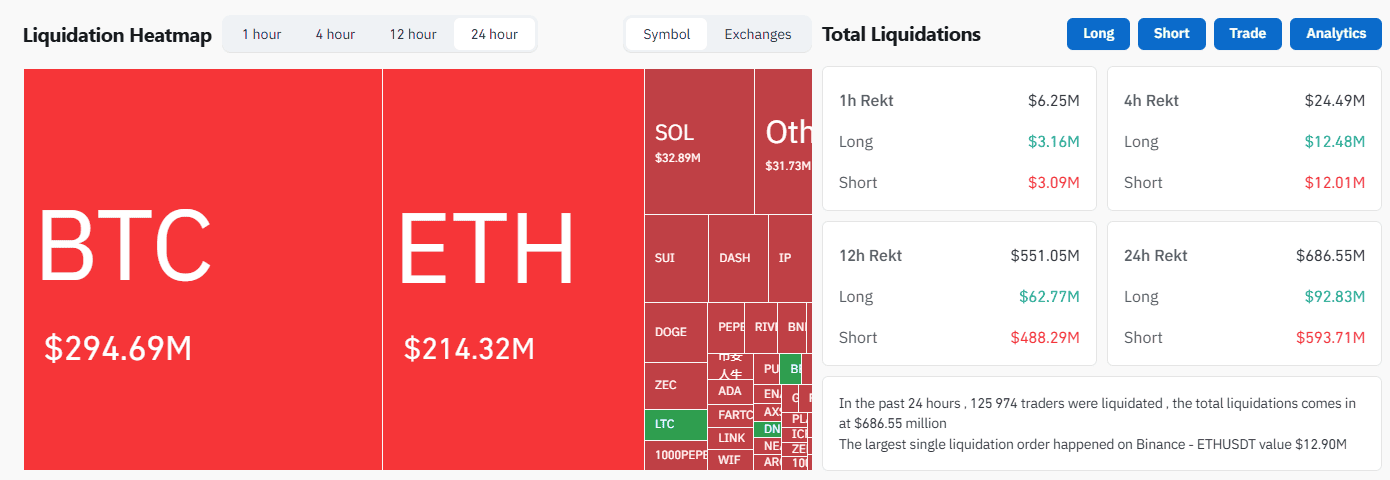 Суточный объем ликвидаций превышает $686 млн. Это почти полностью шорты. Всего под принудительное сокращение позиций попали почти 126 000 трейдеров.