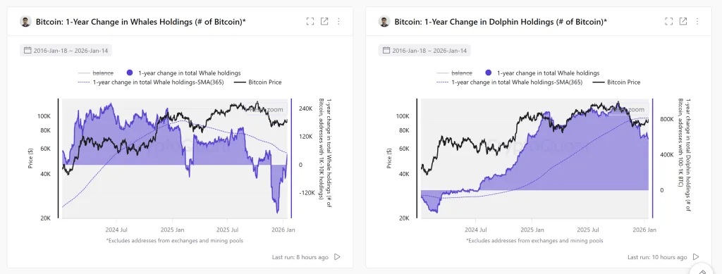 Аналитики CryptoQuant зафиксировали смену тренда у крупных игроков — годовое чистое изменение «китовых» балансов (1000-10 000 BTC) сократилось на 220 000 BTC.