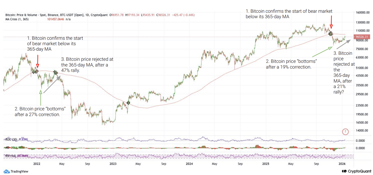 «Аналогичный сценарий разворачивался в 2022 году во время предыдущего медвежьего рынка. Цена биткоина снизилась на 27% после пересечения 365-дневной скользящей средней снизу вверх, затем выросла на 47% и получила откат именно от уровня 365-дневной скользящей средней», — отмечают аналитики.
