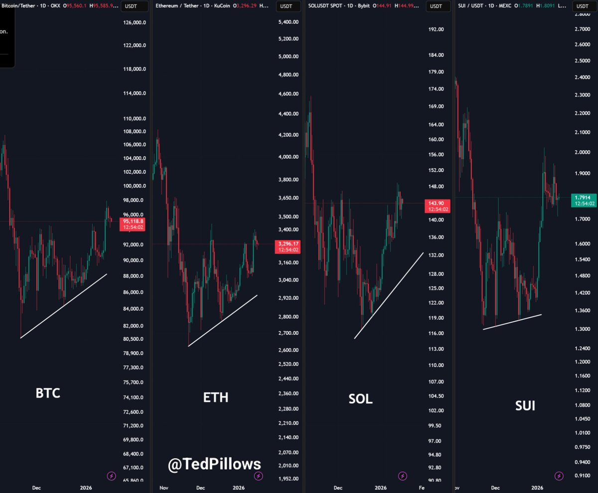Однако другие аналитики видят причины для оптимизма. Тэд Пиллоуз отмечает, что биткоин, Ethereum (ETH), Solana (SOL) и SUI (SUI) уверенно удерживаются выше своих ключевых линий поддержки, что не является временем для медвежьих настроений.