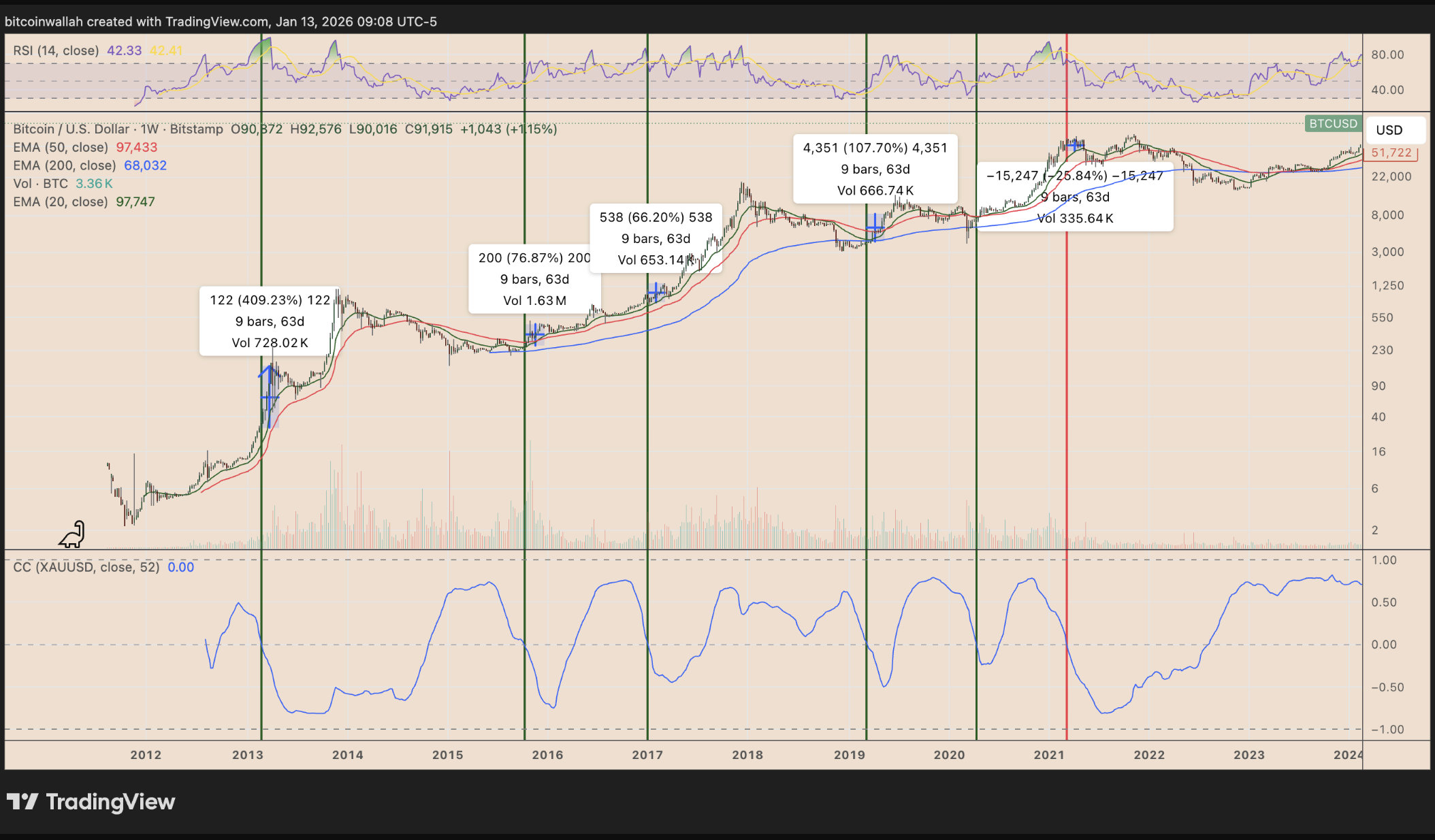 Согласно историческим данным, отрицательная корреляция биткоина с золотом приводила к тому, что цена криптовалюты росла в среднем на 56% примерно в течение двух месяцев. Единственное исключение в мае 2021 года было вызвано внешними шоками, включая репрессии Китая против майнинга и вынужденное сокращение плеча.