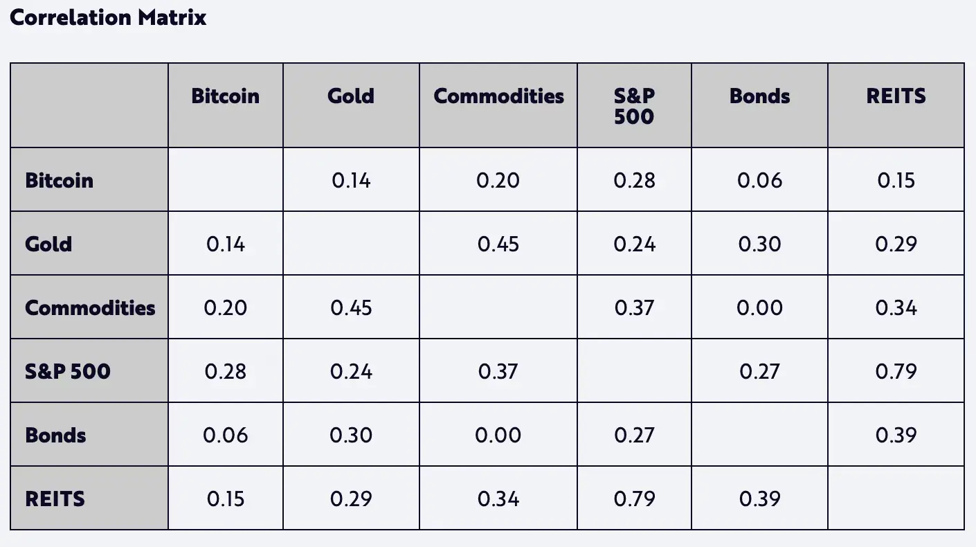 Вуд утверждает: с 2020 года корреляция цены биткоина с акциями, облигациями и даже золотом оказалась ниже, чем корреляция между этими активами. Данные $ARK Invest подтверждают это. Например, корреляция биткоина с индексом S&P 500 составила 0,28 — в то время как корреляция S&P 500 с трастами недвижимости (REITs) достигла 0,79. Это говорит о том, что низкая корреляция биткоина с другими активами делает его относительно более выгодной инвестицией.