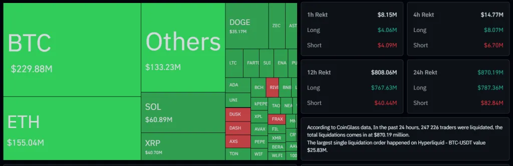 Высокая волатильность привела к массовым ликвидациям на рынке фьючерсов. Всего за четыре часа трейдеры потеряли более $870 млн, причем основной удар пришелся на длинные позиции.