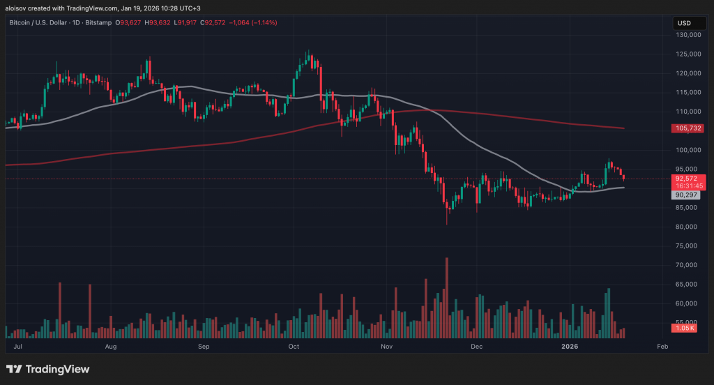 Падение составило 6% от локального максимума 14 января, когда первая криптовалюта приблизилась к отметке $98 000. Текущий уровень $92 000 стал результатом координированных продаж крупных игроков рынка.