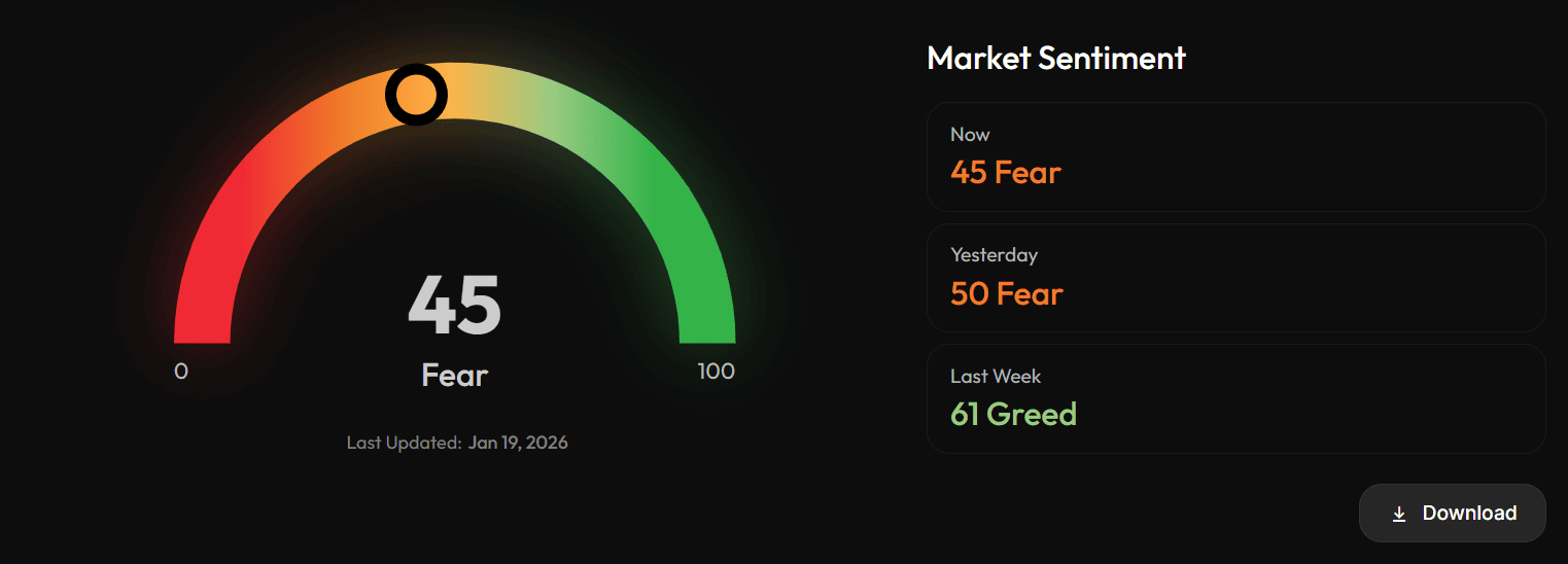 Индекс страха и жадности, который только недавно обновил локальный максимум от начала октября 2025 года, просел на 11 пунктов относительно прошлой недели и на пять пунктов за последние 24 часа.