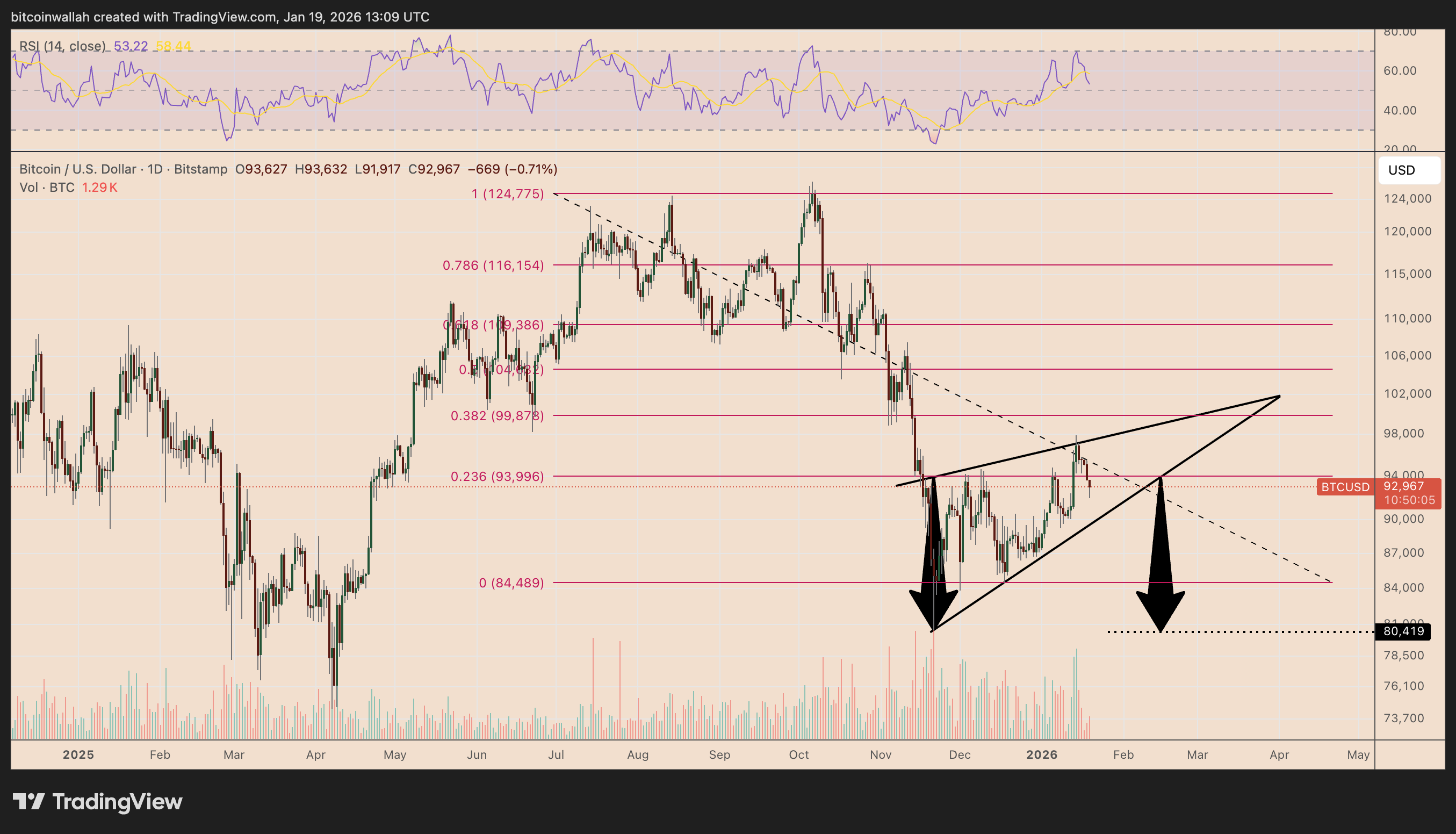 Риск падения до $80 000 становится реальностью. Если первая криптовалюта пробьет фигуру «восходящий клин», цена может покатиться вниз.