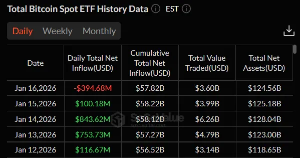 Американские спотовые биткоин-ETF прервали четырехдневную серию поступлений ($1,8 млрд), зафиксировав 19 января чистый отток в размере $394,68 млн.