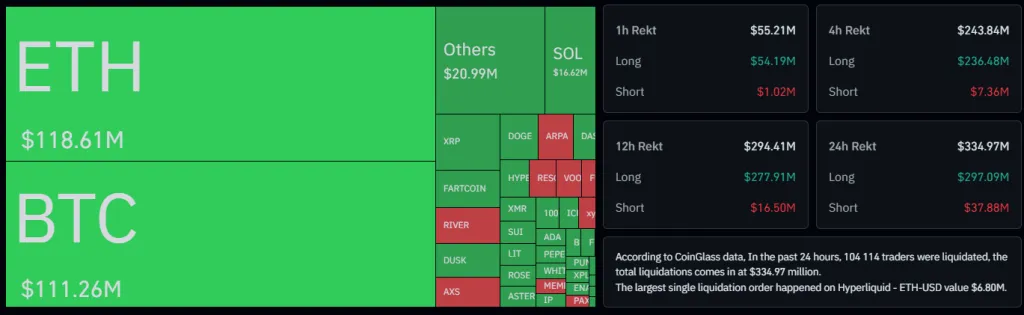 Суточное снижение котировок на 2% спровоцировало ликвидации на $335 млн.
