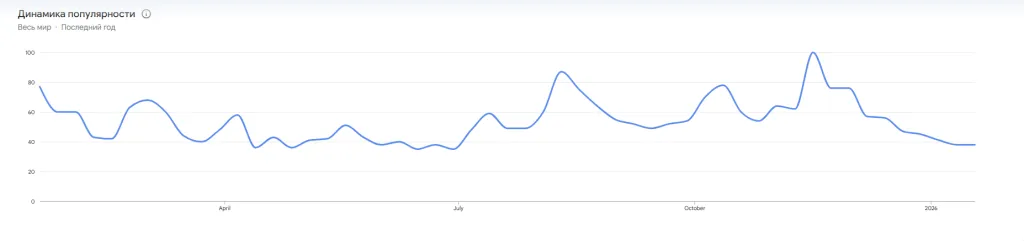 Похожую картину демонстрируют данные Google Trends по запросам «биткоина». Однако на фоне падения рынка в октябре поисковой интерес к активу на короткое время достигал максимальных значений.
