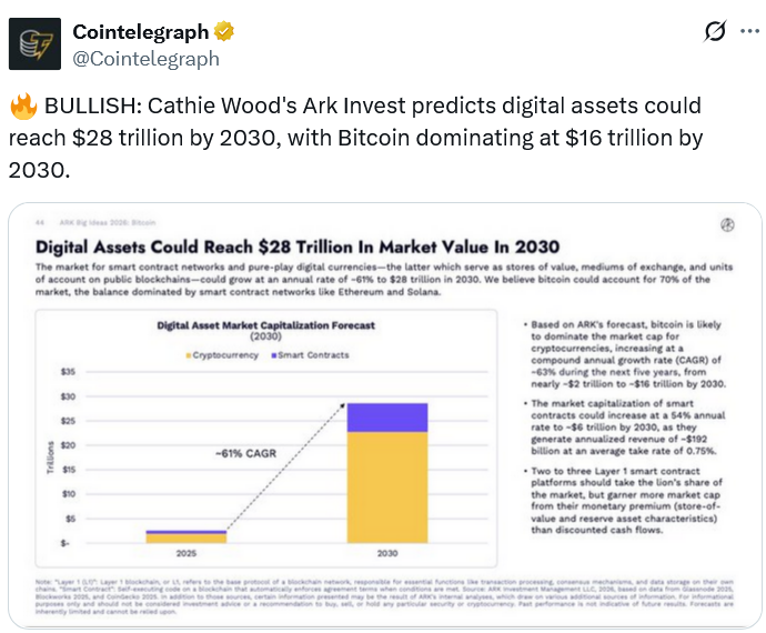 Согласно специалистам, капитализация рынка цифровых активов в целом достигнет $28 трлн со среднегодовым темпом роста (CAGR) 61%, причем на первую криптовалюту придется 70% метрики.
