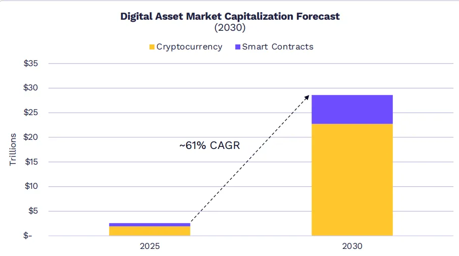 К 2030 году капитализация первой криптовалюты вырастет до $16 трлн, а совокупная стоимость рынка цифровых активов — до $28 трлн. Об этом говориться в отчете ARK Invest Кэти Вуд.