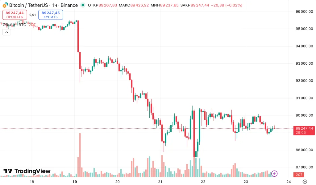 На момент написания биткоин торгуется около $89 200, опустившись на 1% за последние сутки.