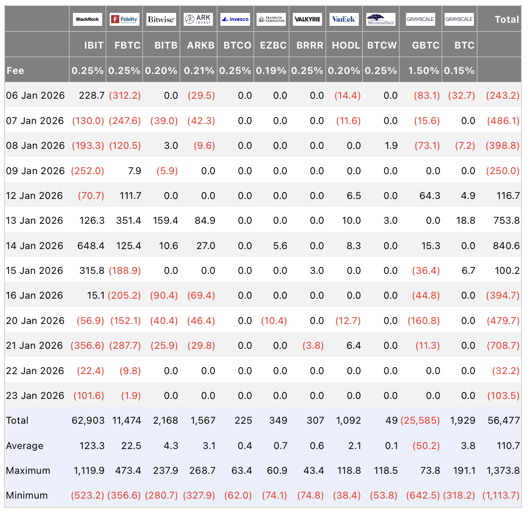 23 января спотовые биткоин-ETF показали чистый отток в $103,5 млн, что стало пятым днем подряд с оттоком средств. Серия началась 16 января, и за весь период, включая сокращенную на день торговую неделю из-за Дня Мартина Лютера Кинга, общий отток составил около $1,72 млрд, согласно данным Farside.