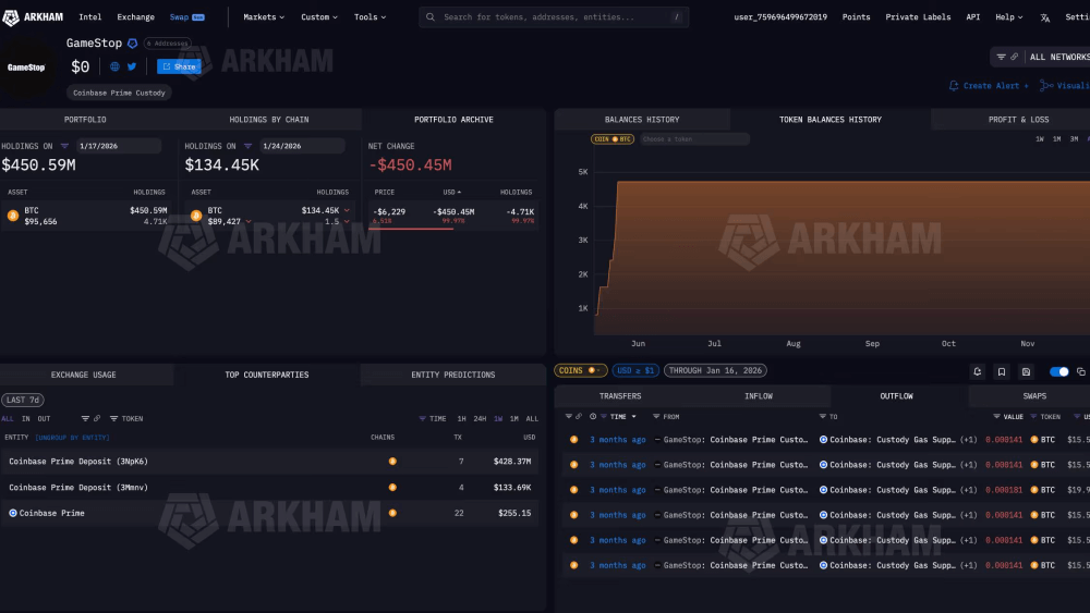 В пятницу аналитическая компания CryptoQuant заметила, что кошелек с надписью GameStop перевел все свои активы - около 4710 $BTC на сумму около 420 000 000 долларов по текущим ценам - в Coinbase Prime, институциональное подразделение американской биржи криптовалют. Данные блокчейна Arkham Intelligence подтверждают эти переводы.