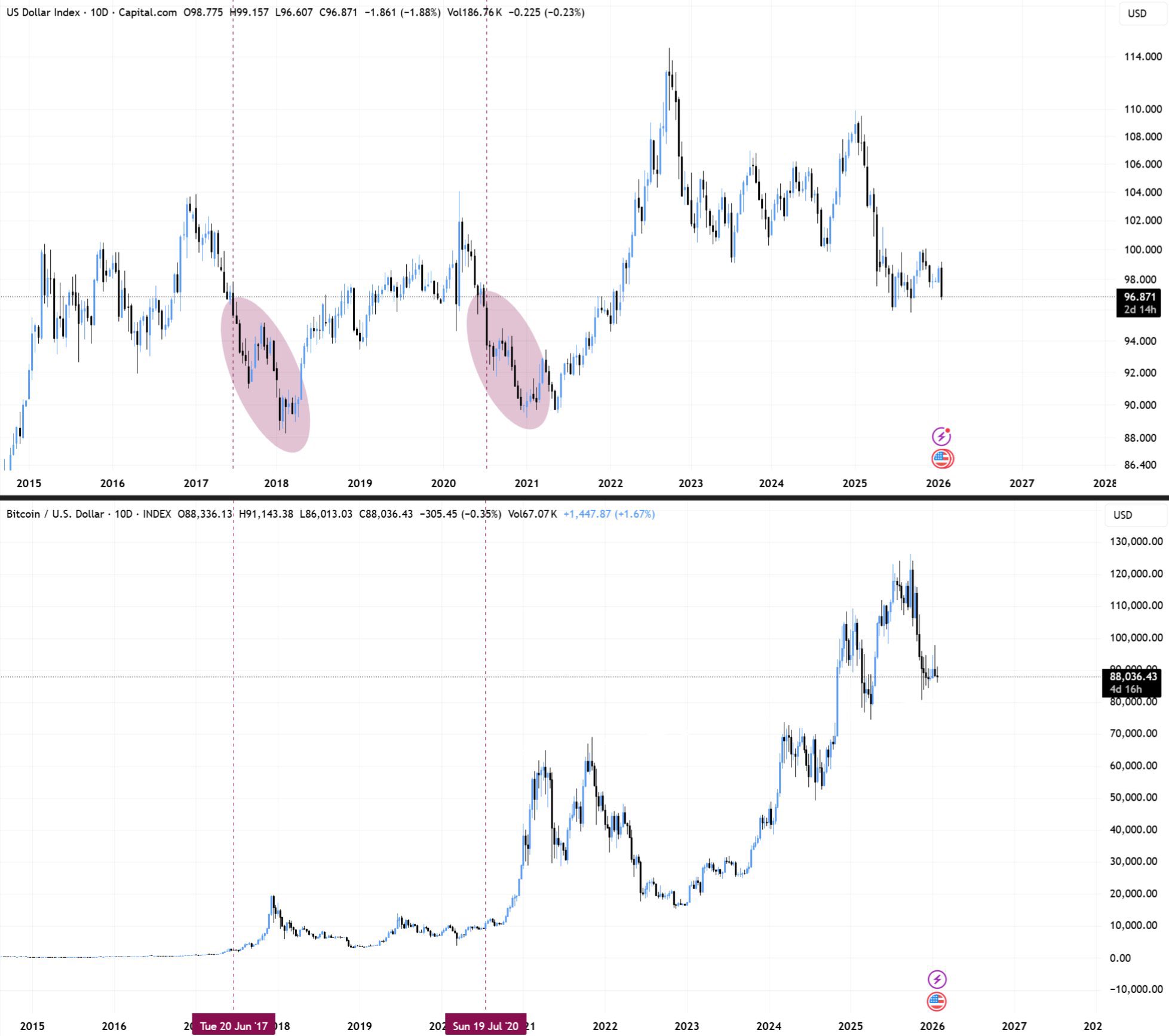 «Исторически, когда DXY опускался ниже 96, биткоин находил дно. Два крупнейших ралли первой криптовалюты также пришлись на периоды, когда индекс доллара падал ниже этой отметки. Теперь, судя по всему, DXY снова близок к резкому снижению», — отметил BitBull.