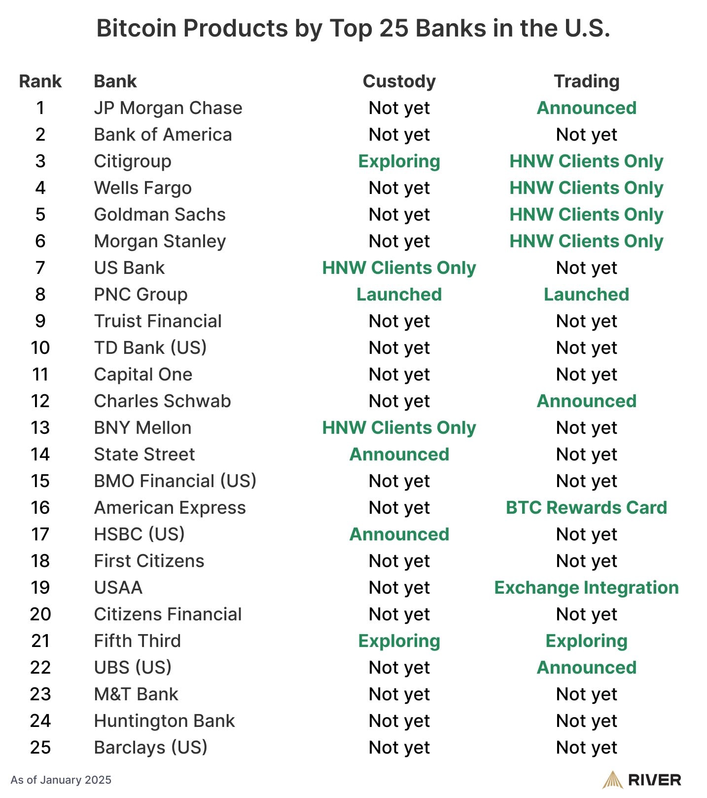 60% крупнейших американских банков начали работу с биткоином, утверждает компания River. Эксперты CoinBureau добавили, что: