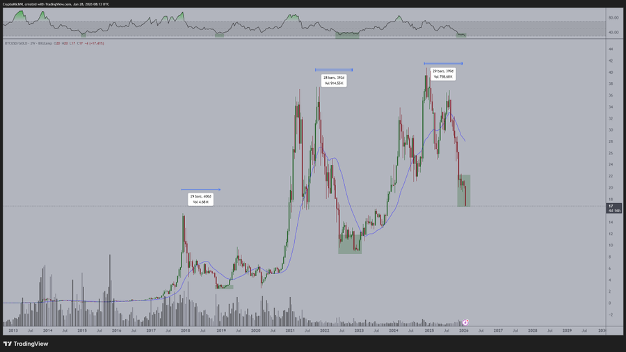 Основатель MN Fund Михаэль ван де Поппе отметил, что биткоин относительно золота опустился до минимумов на недельном индексе относительной силы.