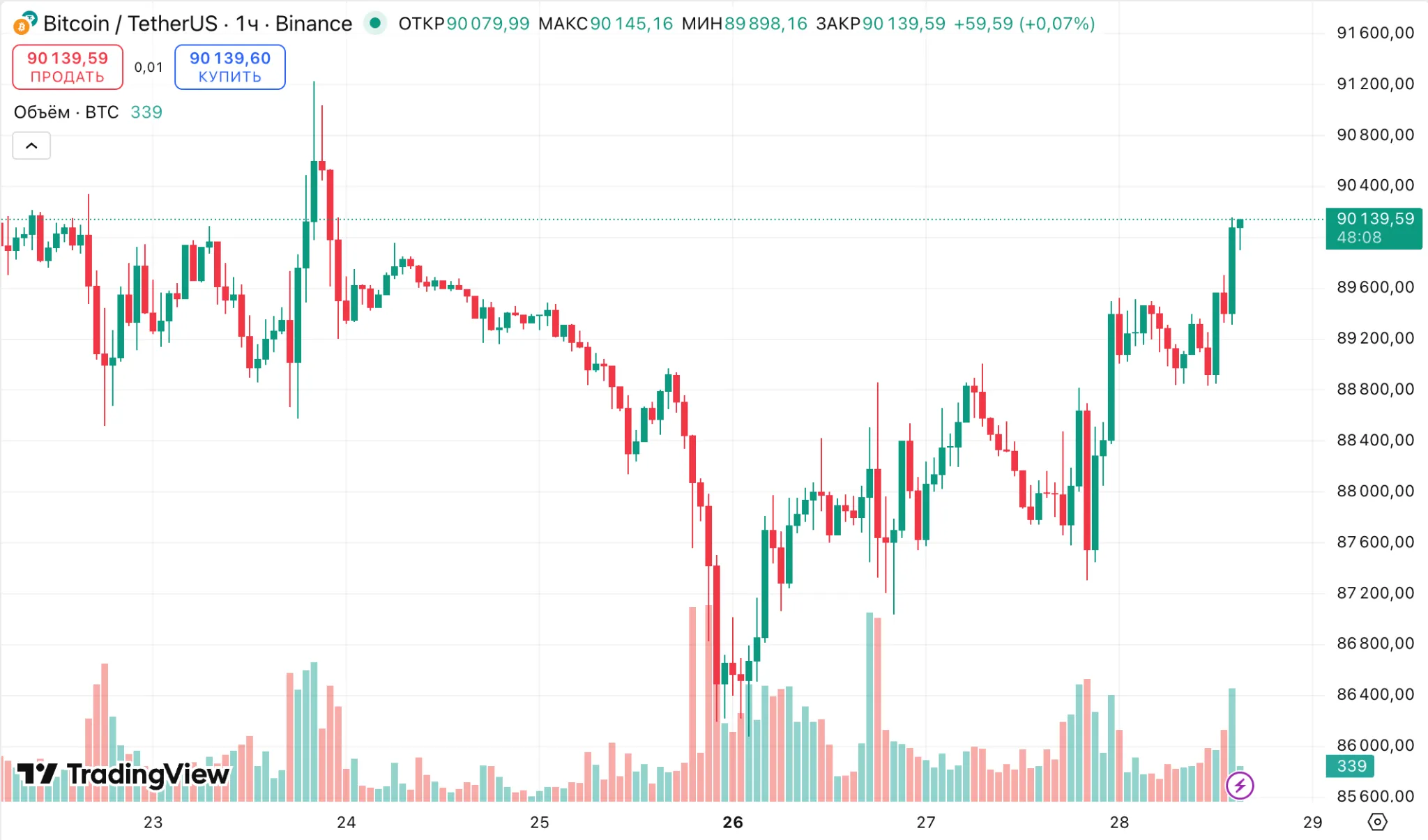В преддверии заседания цена биткоина вернулась к $90 000 — за последние сутки котировки актива выросли на 2,3%.