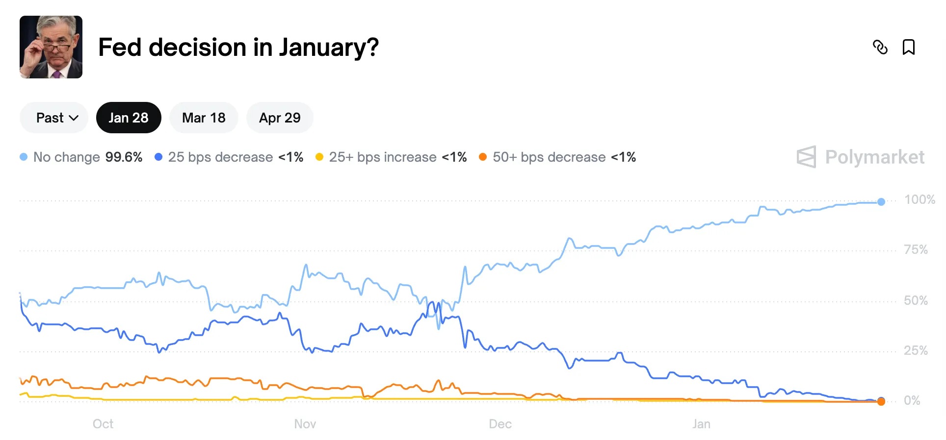 Аналогичная картина наблюдается на рынках предсказаний. Пользователи Polymarket оценивают вероятность снижения или повышения менее чем в 1%.