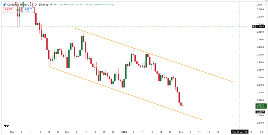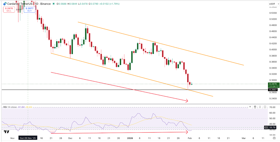 Параболические сигналы SAR остаются расположены выше цены, что указывает на устойчивое давление вниз. Поэтому трейдеры продолжают рассматривать восходящие движения как корректирующие движения, а не как изменяющие тренд.