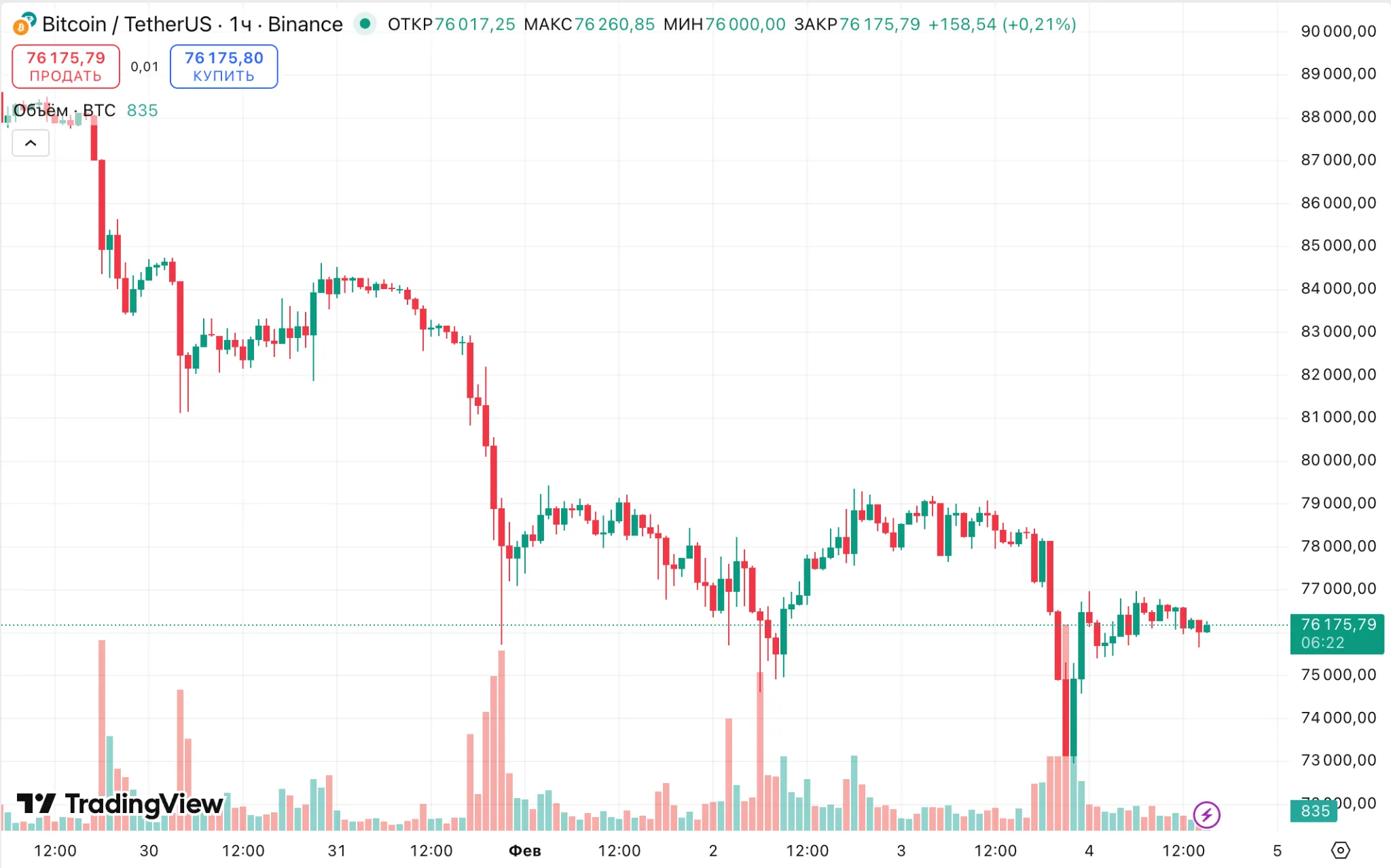 На момент написания биткоин торгуется около $76 100, немного восстановившись после просадки до $73 000.