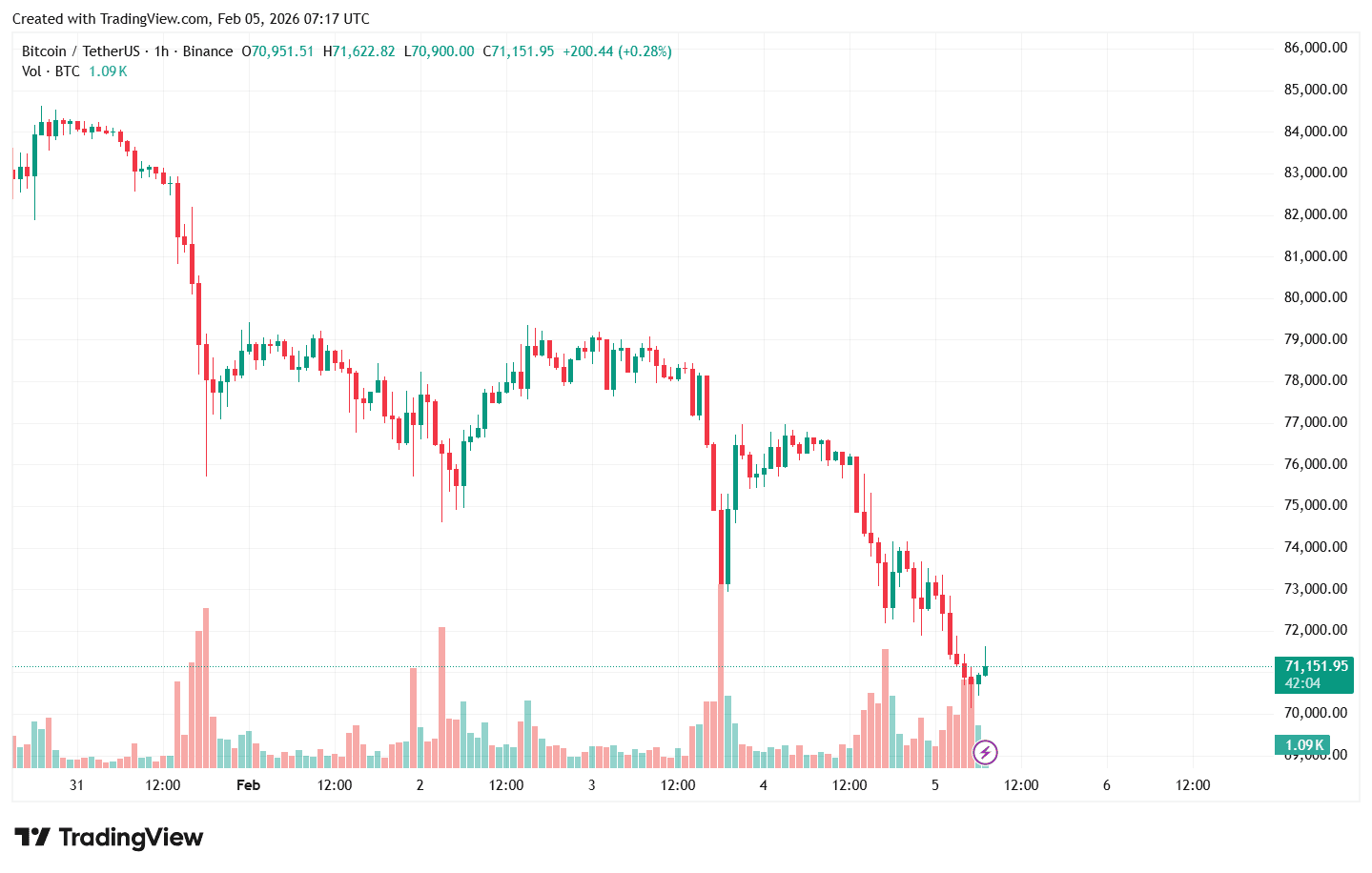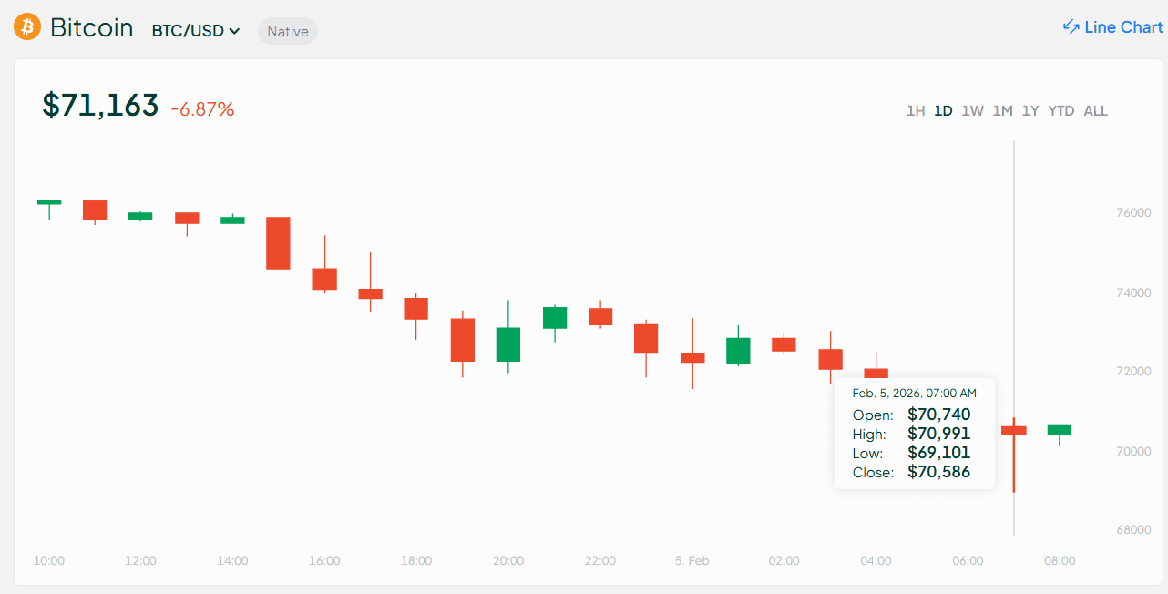 Рано утром 5 февраля 2026 года курс биткоина опустился в моменте до $70 145, согласно TradingView. Суточный объем ликвидаций по фьючерсным контрактам превышает $853 млн, по данным CoinGlass.