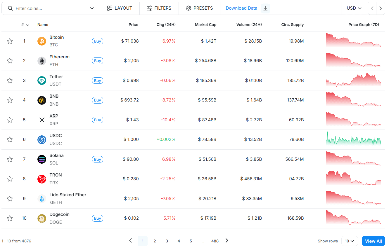 На момент подготовки этого материала курс частично восстановился. Биткоин торгуется по $71 152. На суточном чарте просадка составляет 2,6%, на недельном — 20,2%.