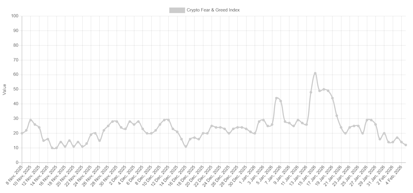 Индекс страха и жадности на рынке криптоактивов, который служит индикатором настроений трейдеров, опустился до 12 пунктов. Это новый минимум от середины декабря 2025 года.