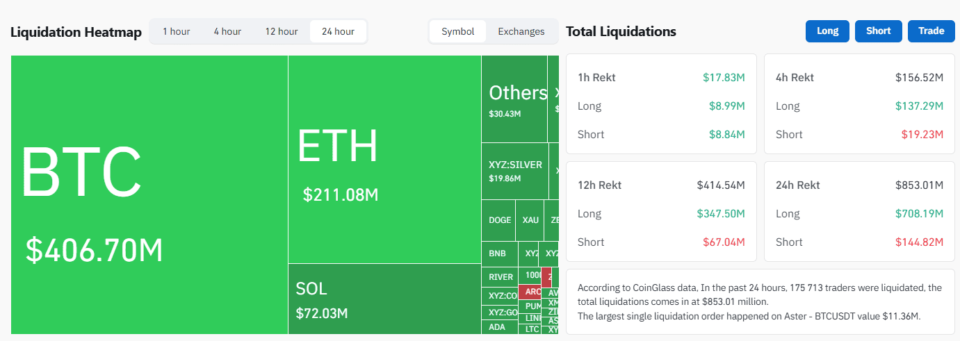 Суточный объем ликвидаций по фьючерсным контрактам превышает $853 млн, согласно CoinGlass. По позициям превалируют лонги. Всего под принудительное сокращение позиций попали 175 713 трейдеров. Среди активов лидируют биткоин и Ethereum, на них приходится более $600 млн потерь.