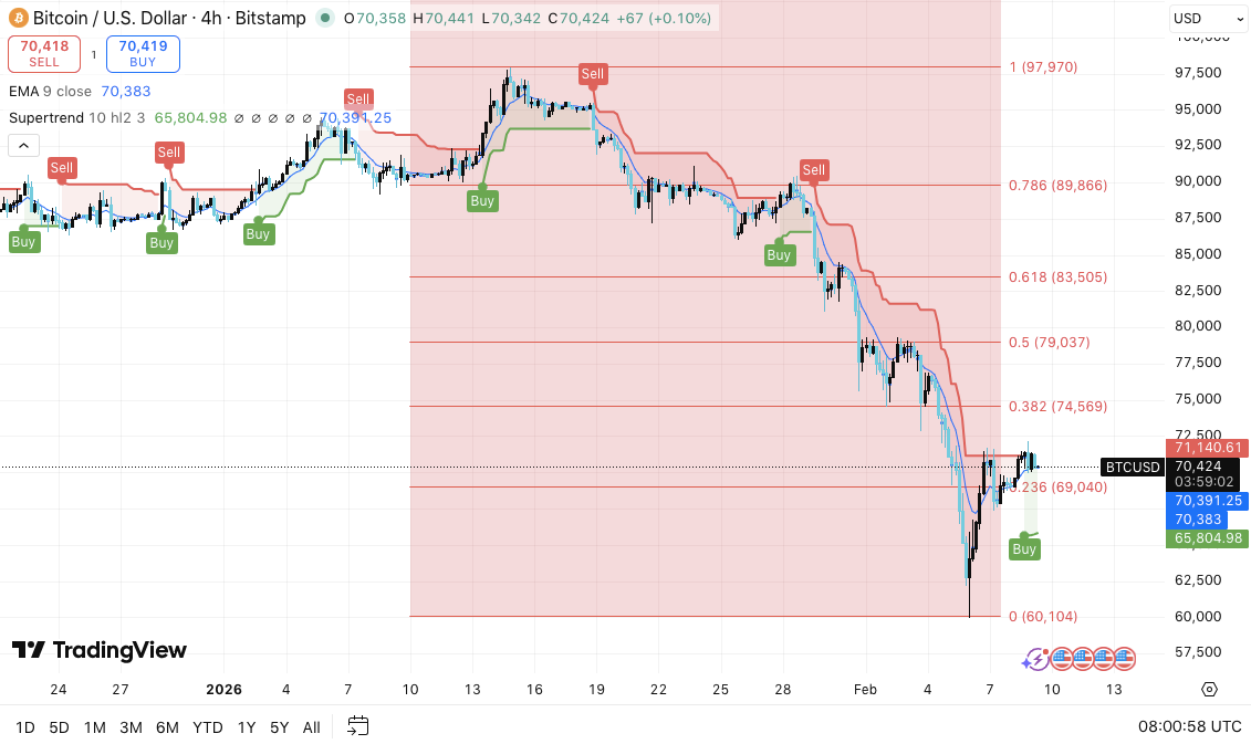 Четырёхчасовой график показывает, что Биткоин удерживается в корректирующей фазе, несмотря на отскок от зоны $60,100. Этот уровень стал самым низким в недавнем цикле и вызвал техническое восстановление. Однако восстановление задержалось ниже 69 040 долларов, что теперь является ключевым опорным центром. Кроме того, цена остаётся ограниченной ниже краткосрочных трендовых индикаторов, что усиливает осторожность.