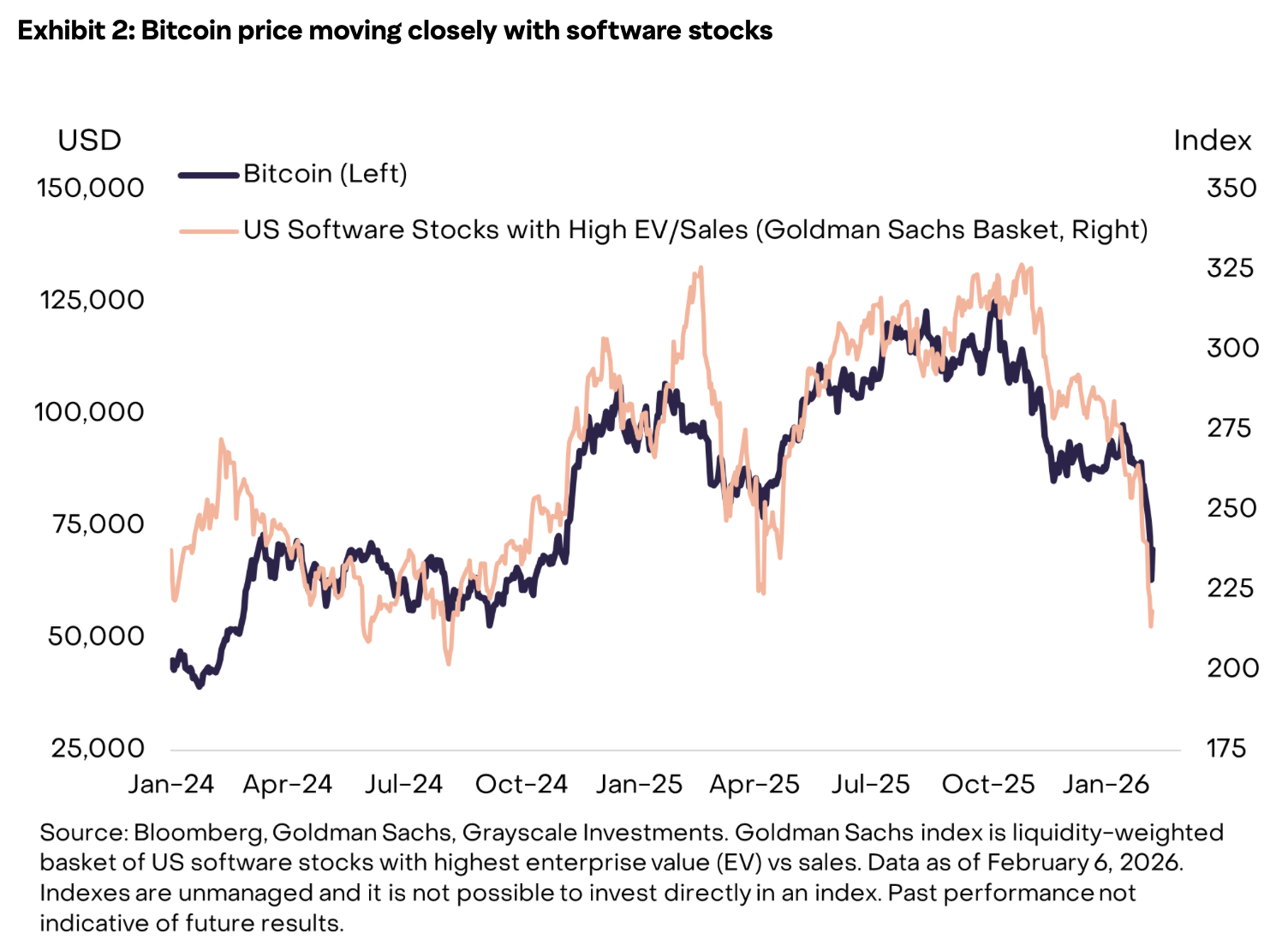 Последнее падение биткоина копирует обвал акций технологических фирм с начала 2026 года. Отчет указывает, что растущая чувствительность биткоина к акциям и активам роста отражает его более глубокую интеграцию в традиционные финансовые рынки, что отчасти обусловлено участием институциональных инвесторов, активностью биржевых фондов и изменением макроэкономических настроений относительно рисков.