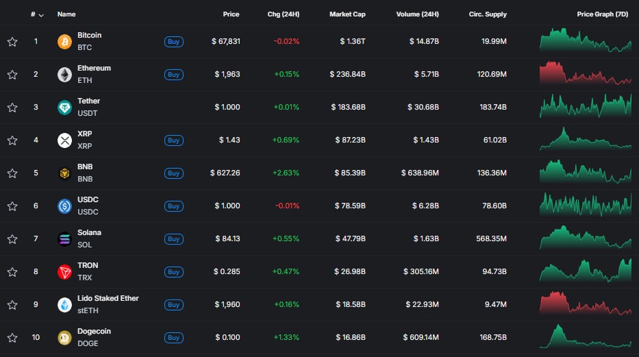 Альткоины также не показали выраженного импульса. В частности, топ-10 криптовалют по рыночной капитализации продемонстрировали рост около 1% за сутки.